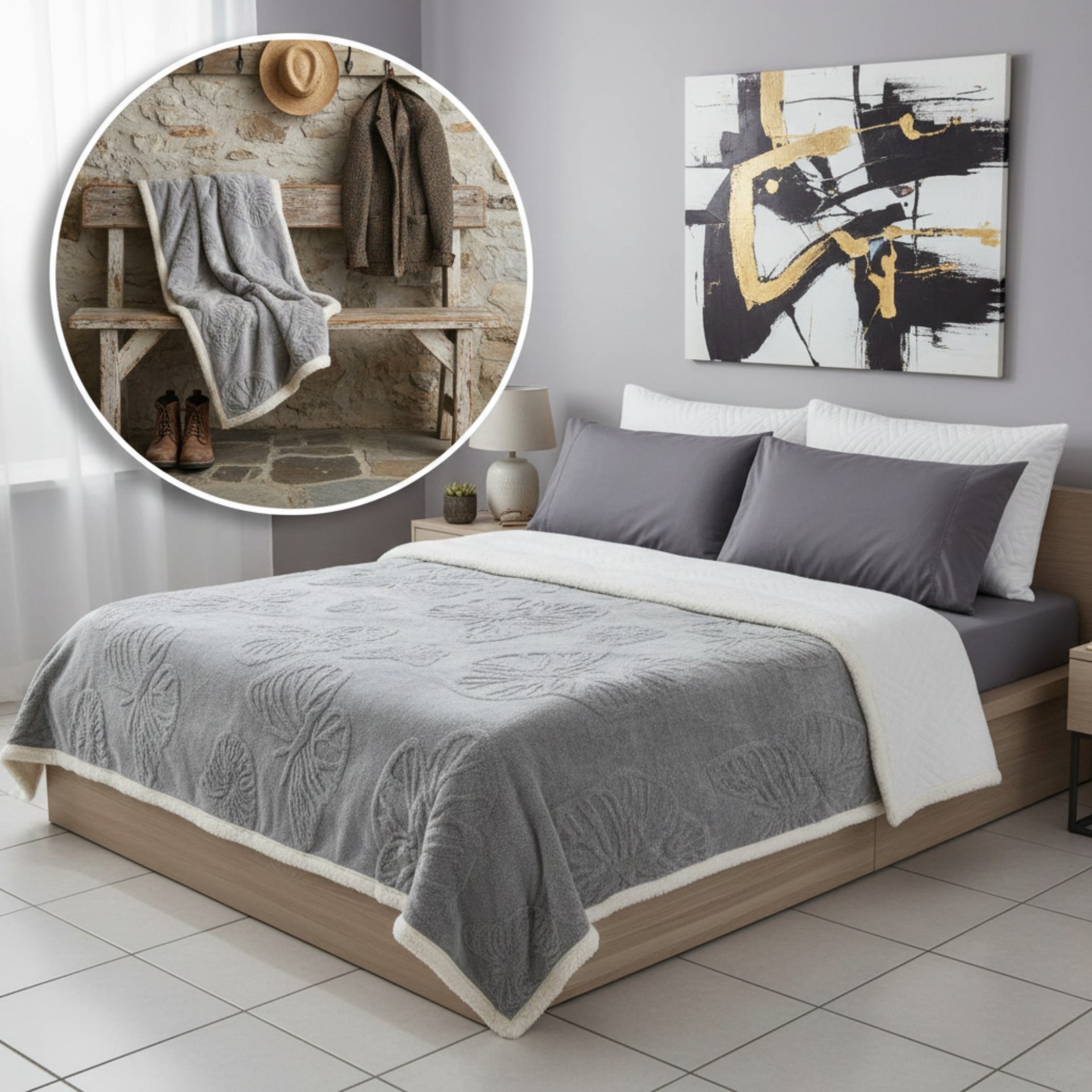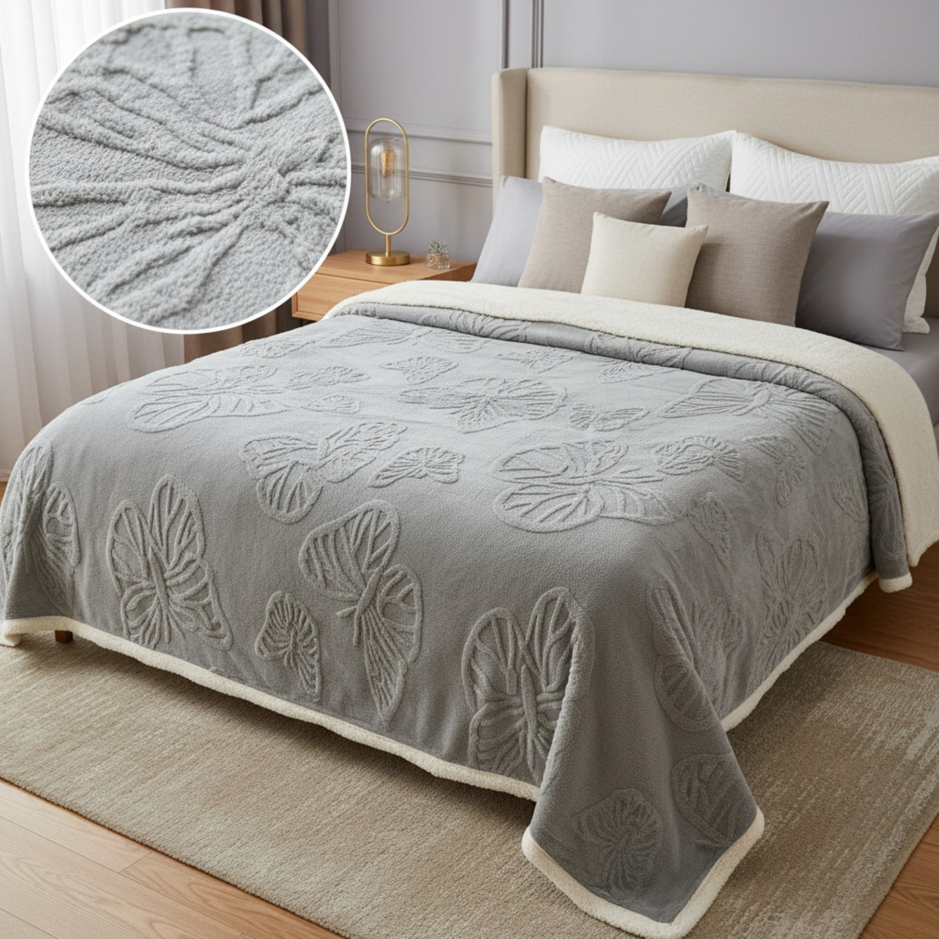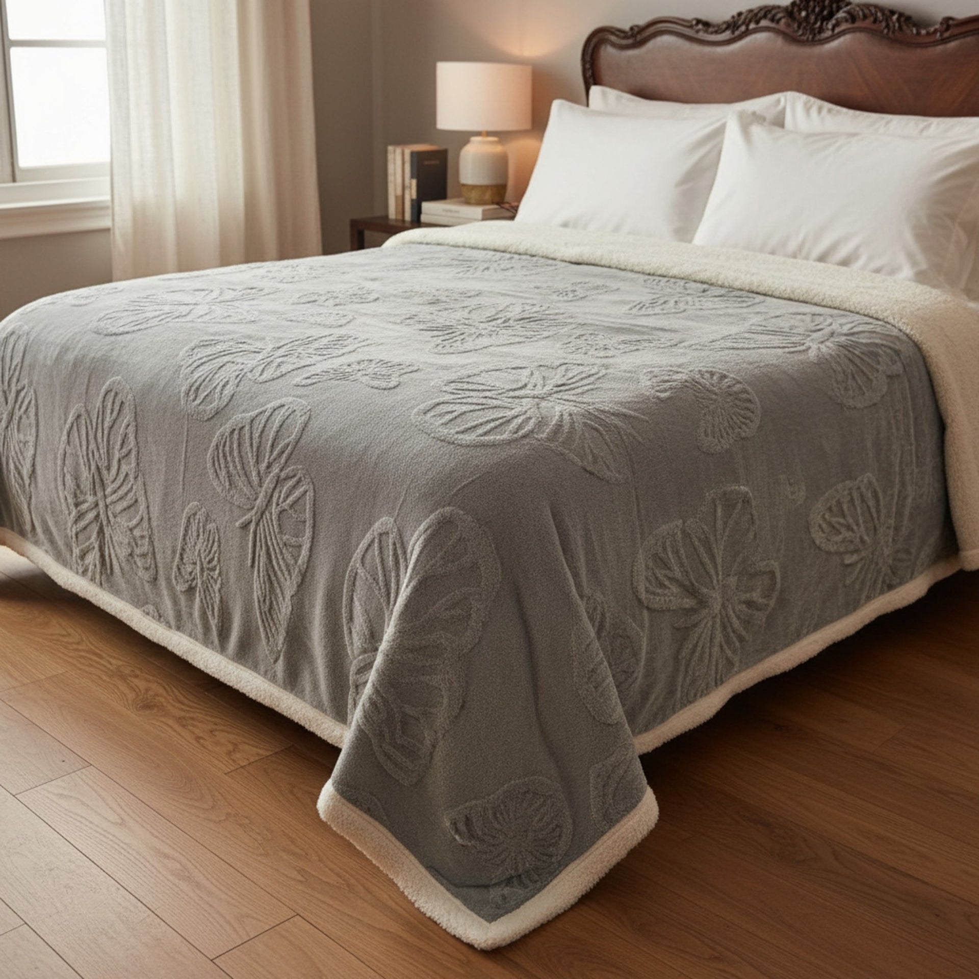 El acabado aborregado en su interior conserva el calor de manera eficiente, ideal para las noches frías, mientras que su diseño exterior con grabados elegantes y modernos aporta un toque sofisticado a tu habitación. No es solo un cobertor, es una combinación perfecta de estilo y comodidad.