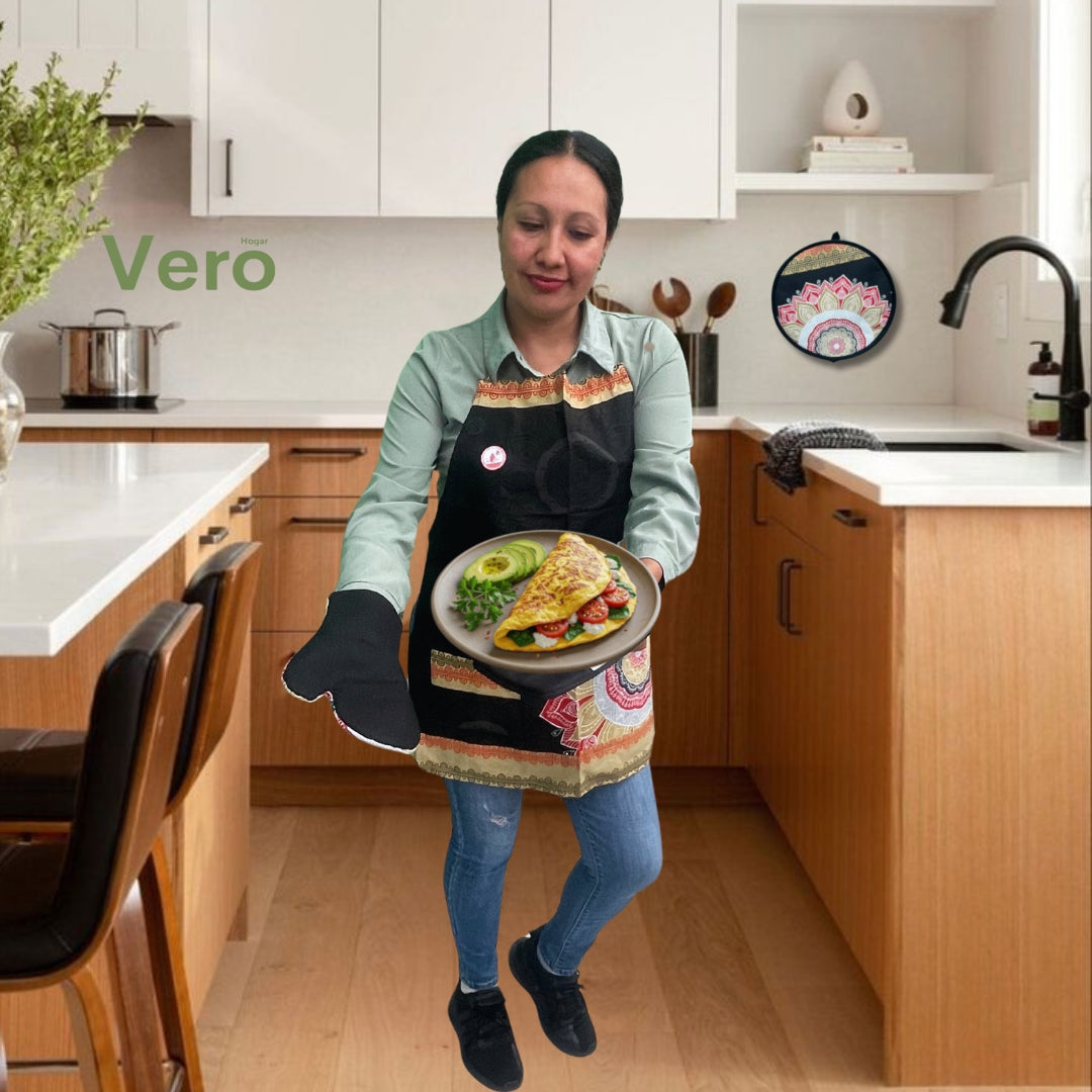 El guante de cocina y el secador agarradera complementan perfectamente el mandil, ofreciendo una experiencia completa y práctica. Este conjunto es ideal para cualquier persona que desee añadir un toque festivo a su cocina, sin sacrificar la funcionalidad. Con Vero Hogar, cada momento en la cocina se convierte en una celebración.